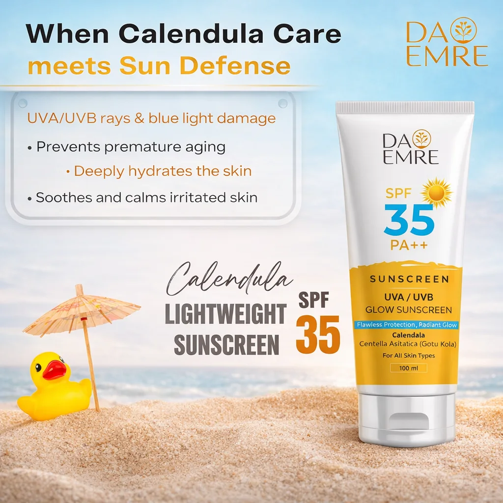 Care for and protect your skin with Calendula & Centella Asiatica (Gotu Kola) Sunscreen SPF 35. This gentle yet effective sunscreen is enriched with the soothing properties of calendula and the skin-repairing benefits of Centella Asiatica to help calm, hydrate, and strengthen the skin barrier while providing reliable protection against harmful UVA and UVB rays. Its lightweight, non-greasy formula absorbs easily without leaving a white cast, making it ideal for daily use. Designed to protect and nourish at the same time, this SPF 35 sunscreen keeps your skin comfortable, healthy, and naturally radiant throughout the day.