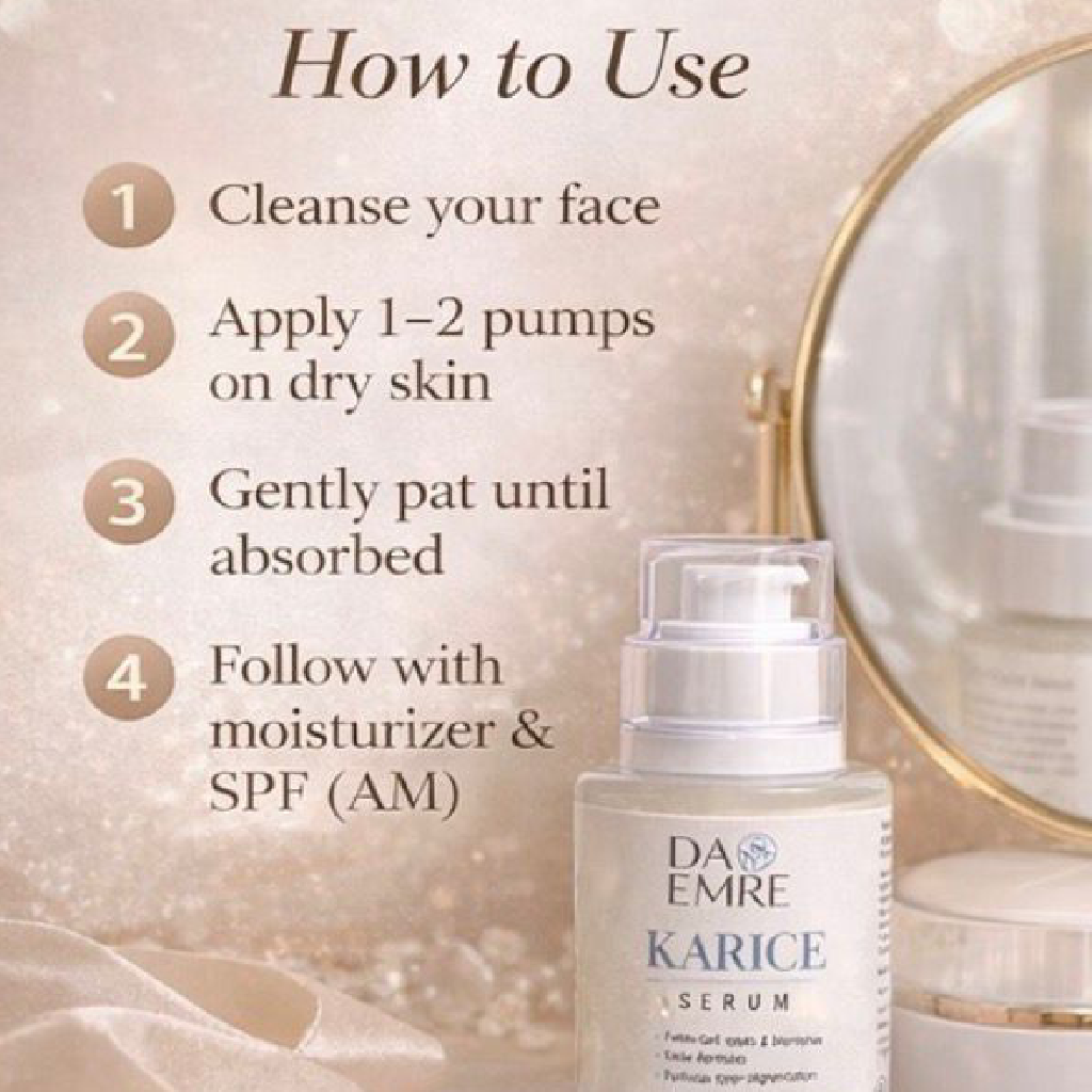 DAO EMRE Karice Serum is a lightweight, fast-absorbing skincare formula designed to improve overall skin clarity, texture, and radiance. Enriched with carefully selected active ingredients, this serum helps support skin brightening, hydration, and repair, making it suitable for daily skincare routines.