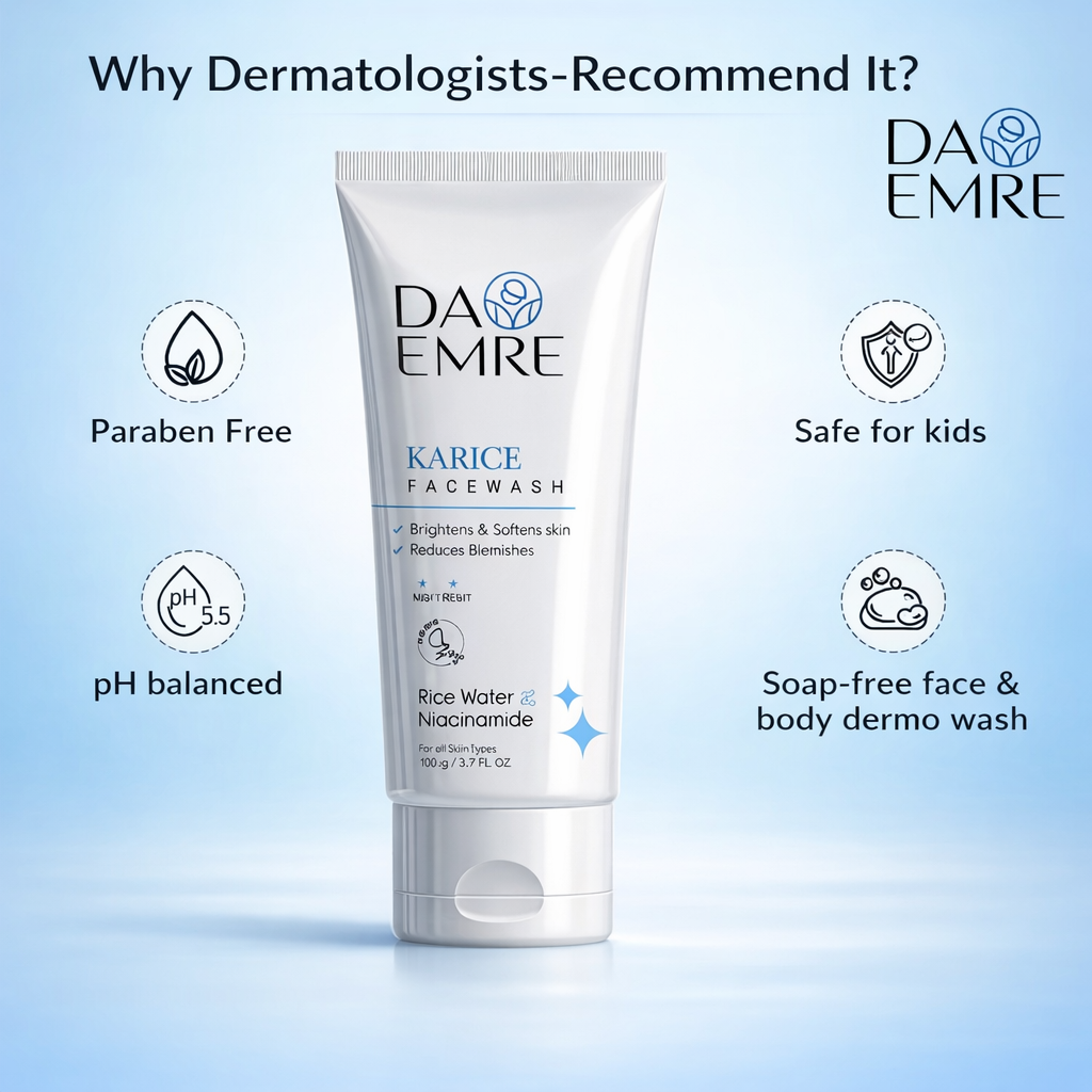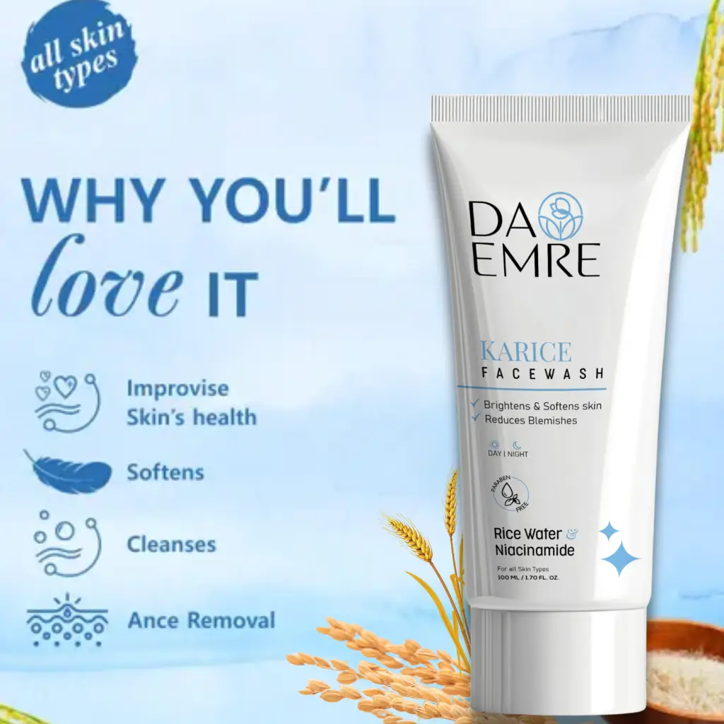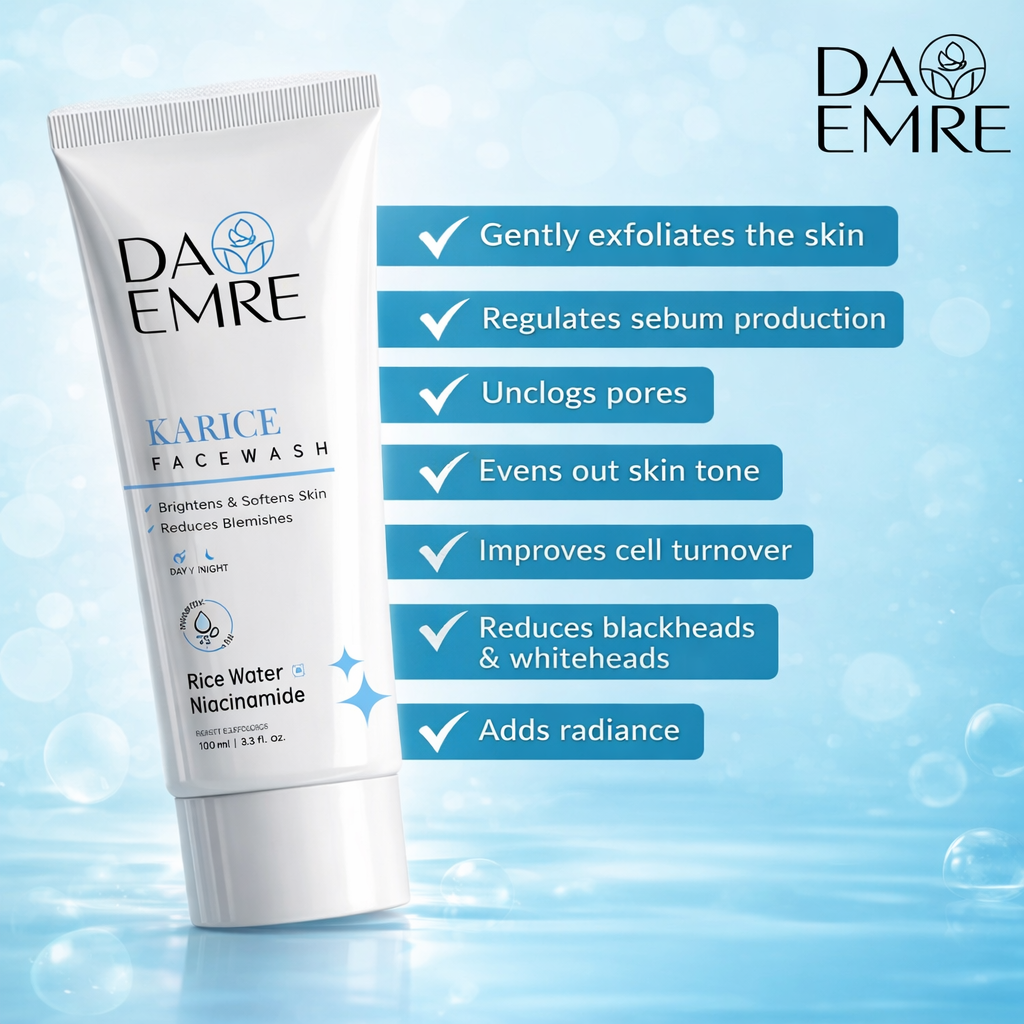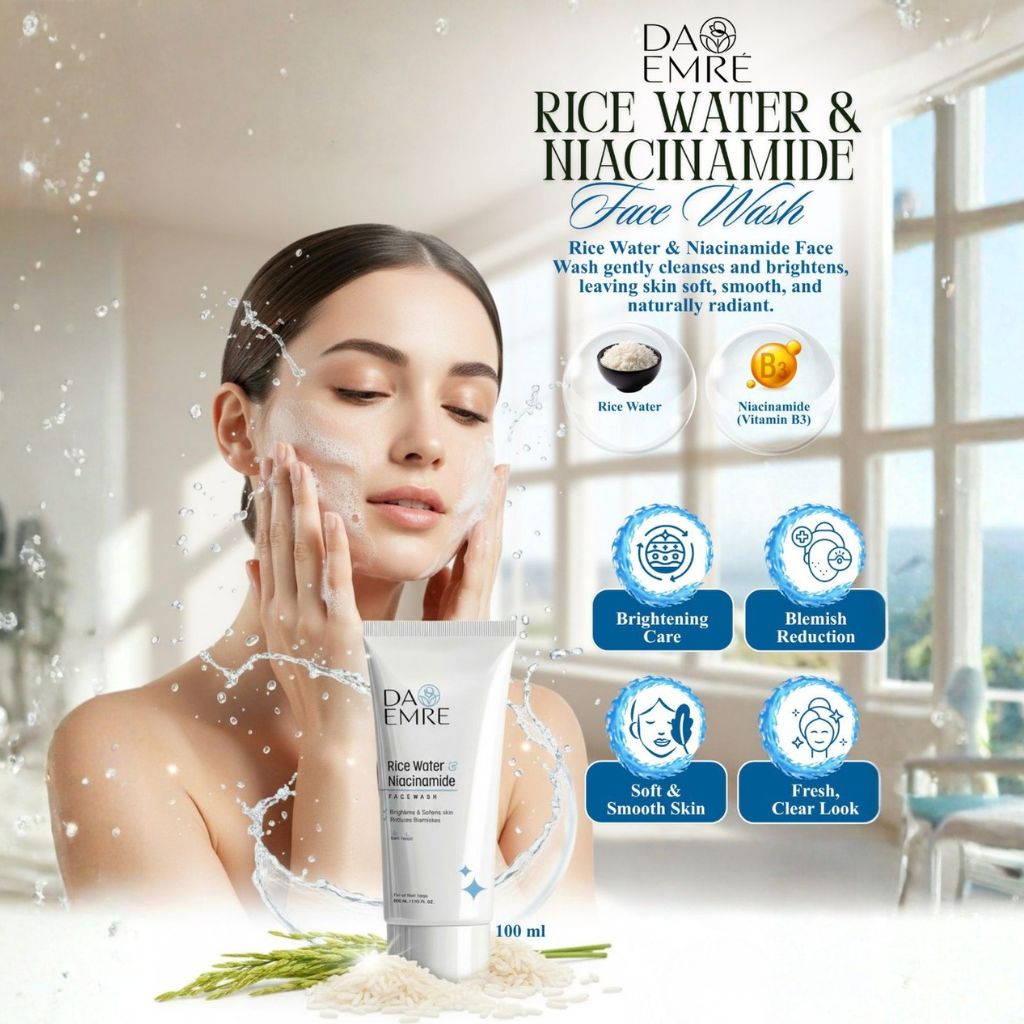 DA EMRE Rice Water & Niacinamide Face Wash is a gentle yet effective cleanser designed to deeply cleanse and brighten your skin. Enriched with the goodness of Rice Water and Niacinamide (Vitamin B3), it helps improve skin clarity, reduce blemishes, and promote a naturally radiant complexion. Rice Water nourishes and smoothens the skin, while Niacinamide helps balance oil, minimize spots, and strengthen the skin barrier. This face wash removes dirt, excess oil, and impurities without stripping moisture, leaving your skin soft, fresh, and visibly clear after every wash.
